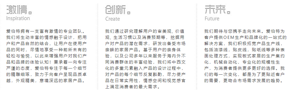愛(ài)伯特家居有限公司屬中外合資企業(yè),成立于2007年,坐落于福建漳州北斗工業(yè)園區(qū),占地66000平方米。對(duì)于板式家具,木質(zhì)家居產(chǎn)品,我們專(zhuān)業(yè)的團(tuán)隊(duì)有著世界頂級(jí)的生產(chǎn)能力,產(chǎn)品原料及品質(zhì)要求符合國(guó)際各類(lèi)管理體系的標(biāo)準(zhǔn)。愛(ài)伯特自創(chuàng)始之日起至今,始終保持超乎尋常的成長(zhǎng)速度。我們與(HomeDepot,Lowes,Aldi,Lidl